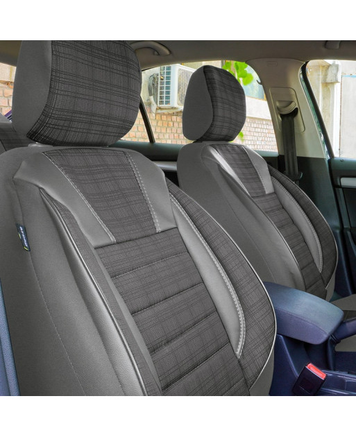 Huse scaune auto din material textil dublu laminat, similar cu tapiteriile originale, cu insertii de piele ecologica si ambele fete dublate cu burete (grosime 5mm).